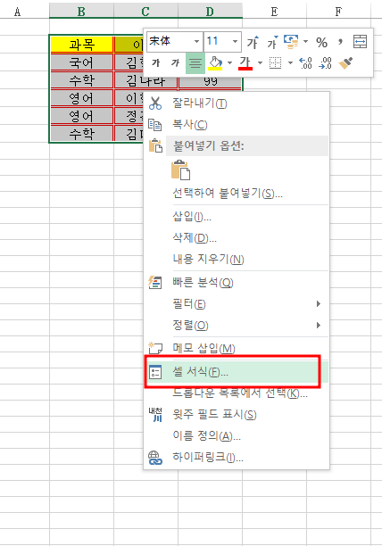 다른 방법으로는 오른쪽 마우스 클릭 후, 셀서식에 가서 지정을 해줍니다.