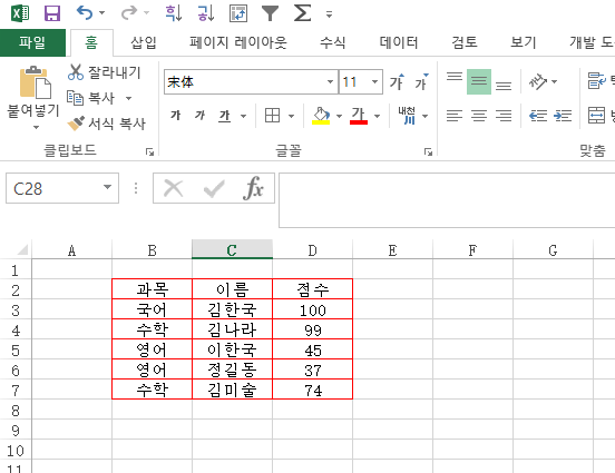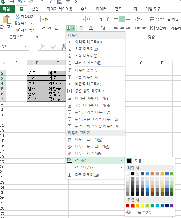임의로 과목별 점수를 넣어보았습니다. 여기서 테두리는 어떻게 그릴까요?