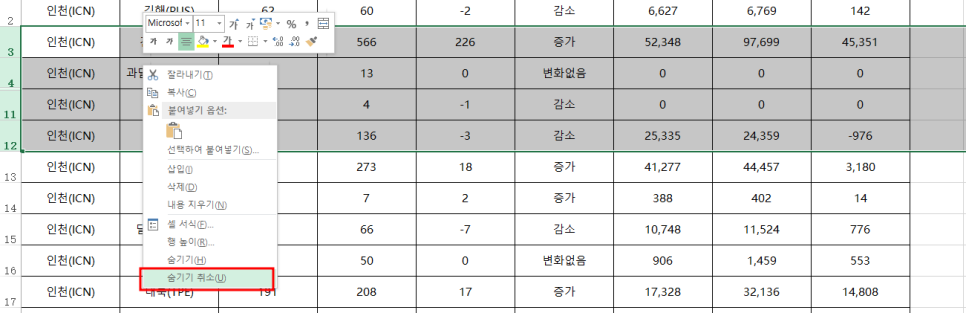 4행부터 11행까지 선택 후 오른쪽 마우스 클릭하면 숨기기 취소가 보입니다. 숨기기 취소를 하면 바로 나타납니다.