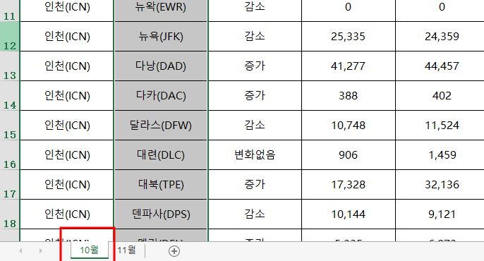 10월 시트가 보인 것을 확인할 수 있습니다. 여기서 우리는 또 시트 숨기기 단축키가 궁금하겠죠.