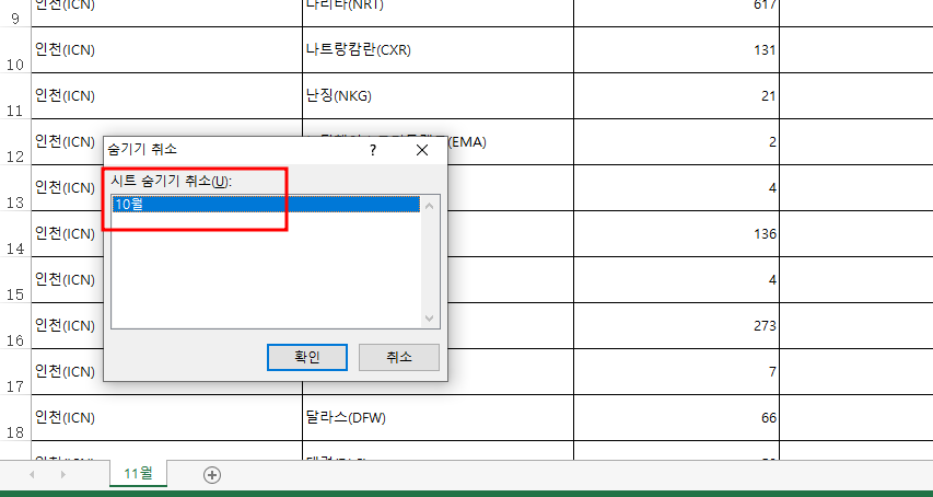 똑같은 방법으로 시트 우측 클릭 후 숨기기 취소를 해주면 다시 10월 시트가 보입니다.
