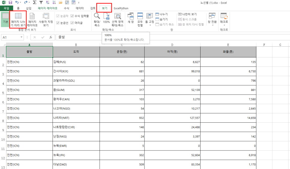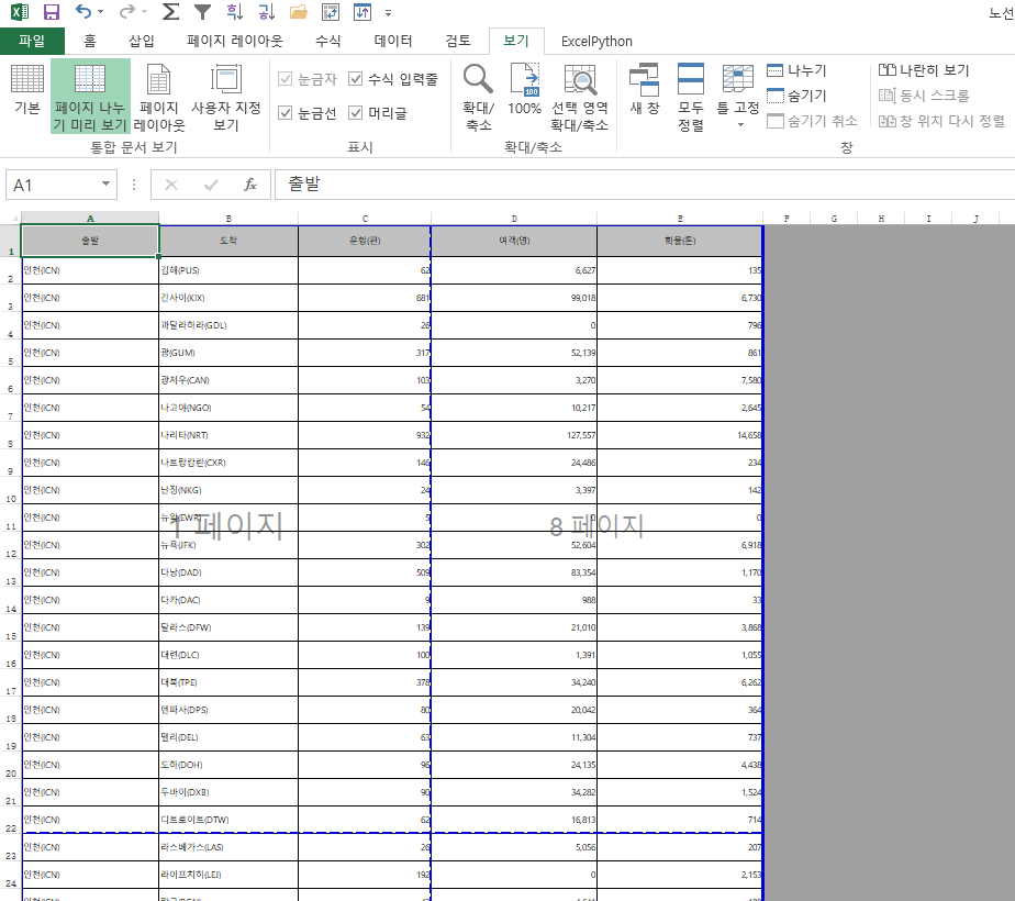 보기- 페이지 나누기 미리보기를 설정하면 페이지가 나누어지는 것을 볼 수 있습니다.