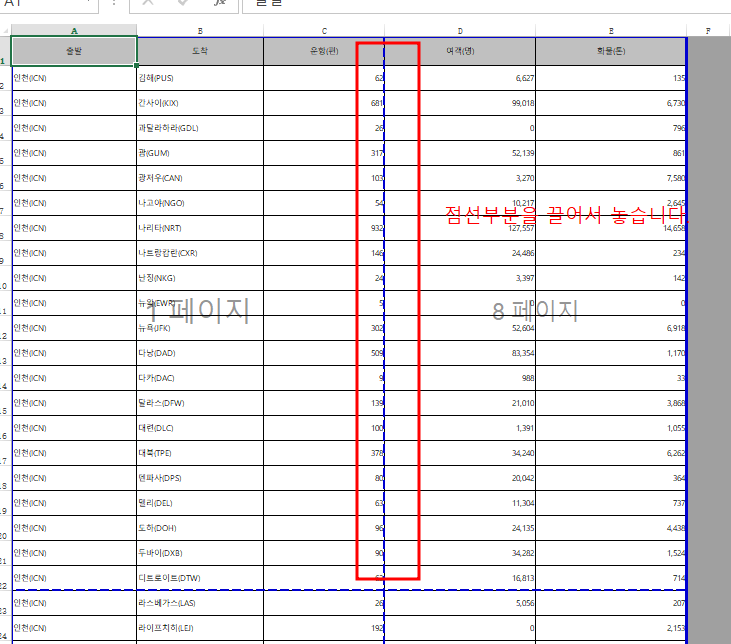 오른쪽화면에는 미리보기를 볼 수 있으며, 현재 항공데이터를 가지고 한번 해보겠습니다. 항공데이터가 잘린 게 볼 수 있습니다.