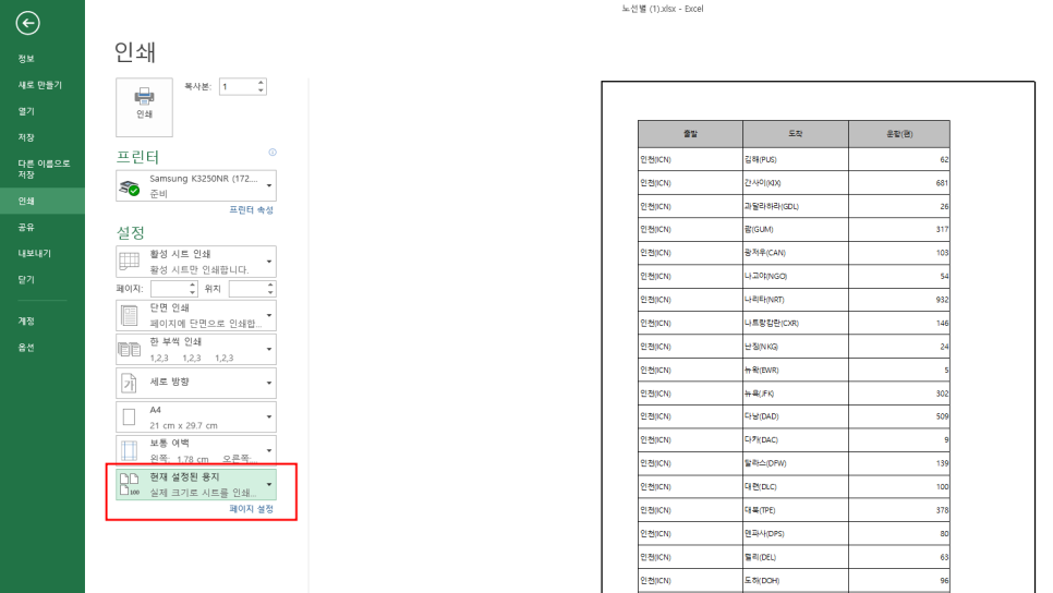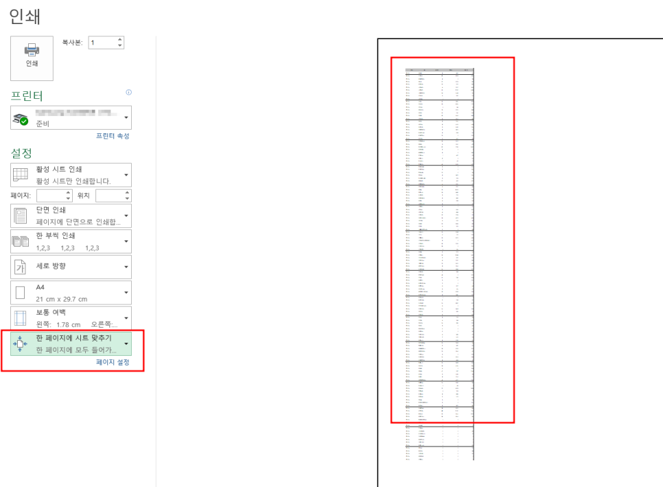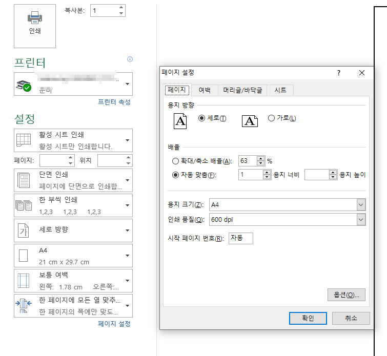 인쇄를 누르면 인쇄 프린터가 잘 준비되어 있는지 확인합니다. 또한 하단에 설정 부분에 활성시트 인쇄, 단면인쇄, 또는 한부씩 인쇄, 세로 방향 가로 방향, A4인지 또는 보통여백 현재설정된 용지를 사용할 것인지에 대해 다양하게 설정을 할 수 있습니다.