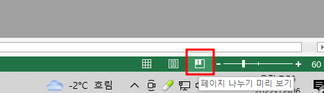 다른 방법으로 페이지 나누기 미리 보기를 보려면 엑셀 오른쪽 하단에 페이지 나누기 미리 보기가 있습니다. 손쉽게 클릭할 수 있죠. 그럼 설정을 해 보아야겠죠. 저렇게 깔끔하지 않은데 설정은 간단합니다.