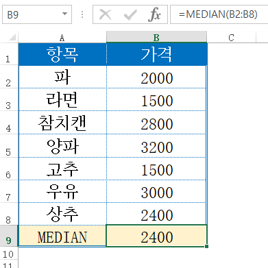 MEDIAN을 이용하여 중간값인 상추의 값 2400원을 출력했습니다.