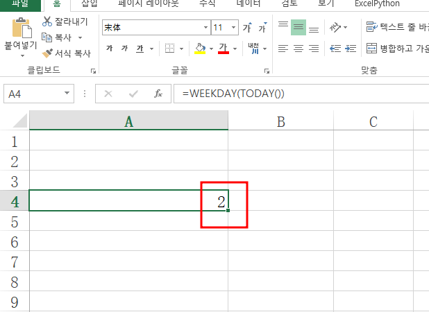 월요일을 1로 반환시키려면 숫자 2를 함수에 넣어주어야겠죠