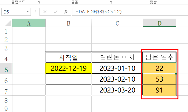엑셀에서 특정 날짜의 간격(일수)을 정확하게 계산하려면 함수를 이용하는 것이 좋습니다.