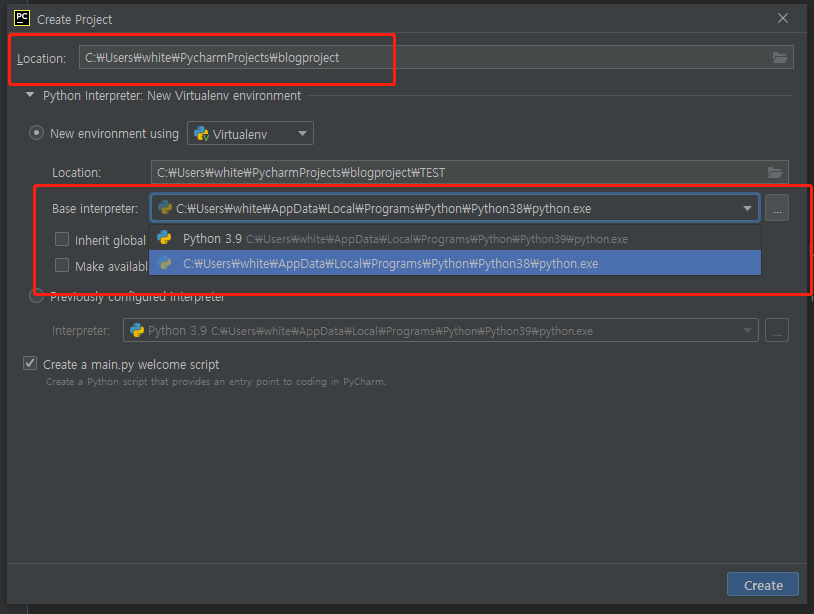 프로젝트가 열리면 위치를 설정해 주고, 파이선 파일들을 저장할 위치를 설정해 줍니다. 그리고 폴더이름도 생성해 주시면 됩니다.