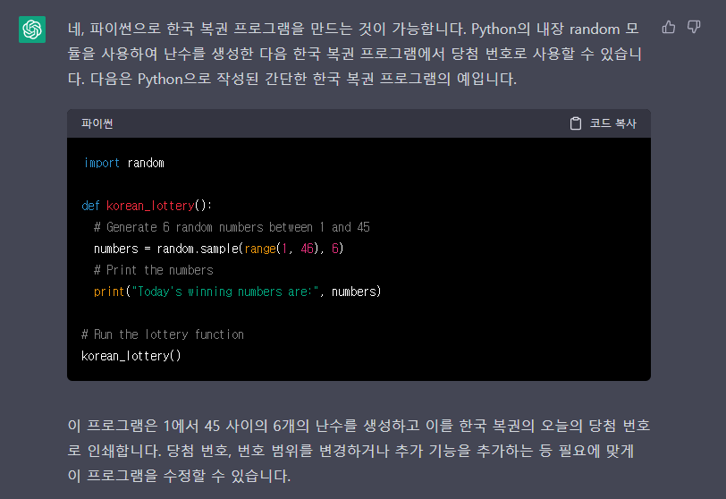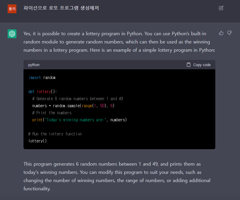파이선으로 로또 프로그램 생성해져라는 질문을 해 보았습니다. 그러니 진짜 로또 프로그램을 생성해 주네요... 와~~~무섭네요