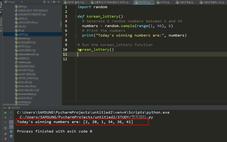 정말 귀가 막힐 노릇입니다. 어떻게 로또 번호를 질문만 했는데 코딩을 할 수 있을까요? 그럼 파이선에서 잘 돌아가는지 확인해 보겠습니다.