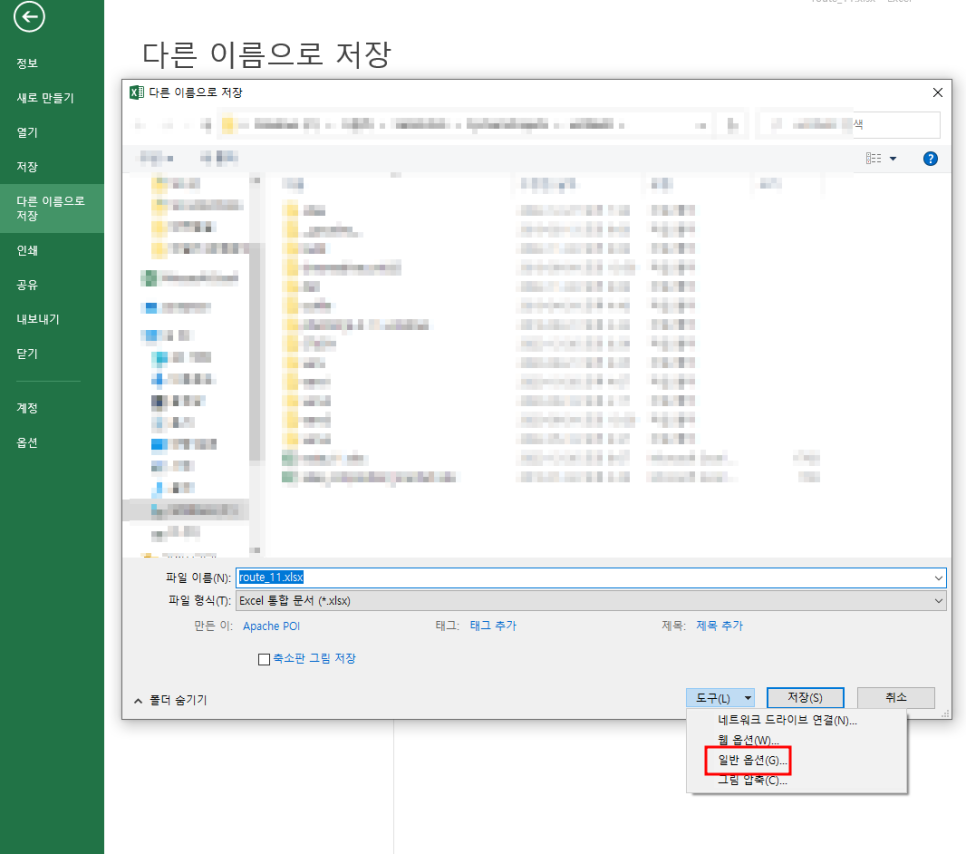 설정 방법: 파일- 다른 이름으로 저장 - 도구 - 일반옵션에서 암호 설정