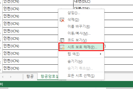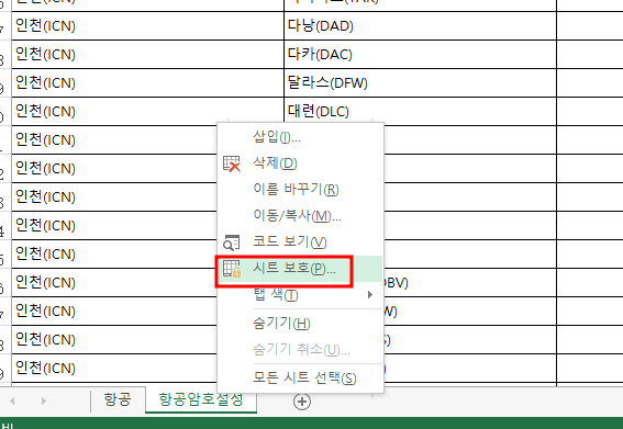 항공이라는 시트를 복사해 줍니다. 그리고 탭에서 우클릭 후, 시트보호를 클릭합니다.