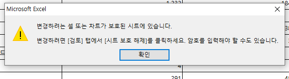 시트를 수정하려고 하면 보호된 시트라고 설정 되어있습니다. 비밀번호를 입력하여 시트보호 해제를 하여야 하겠죠.