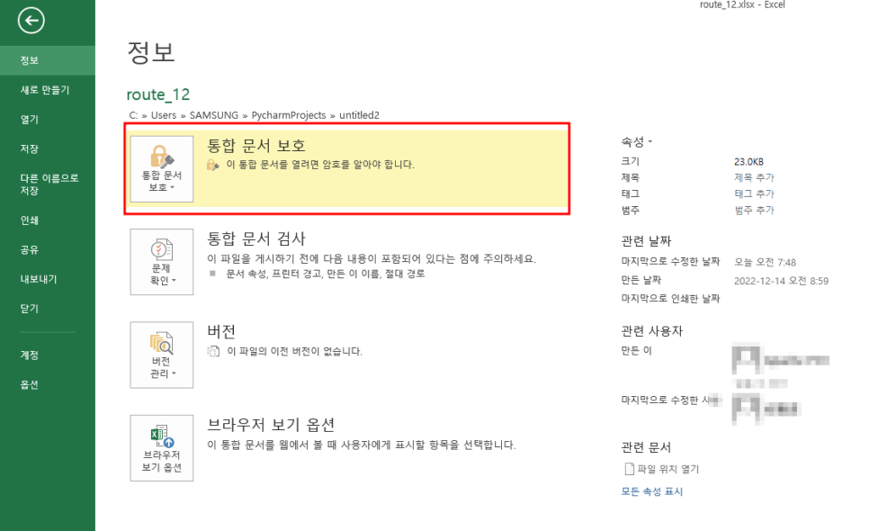 파일- 정보란에서 전체적으로 암호를 설정할 수 있습니다. 1번과 2번에 했던 방식과 동일하지만, 정보란에서는 한 번에 다 할 수 있다는 거 참고해 주세요.