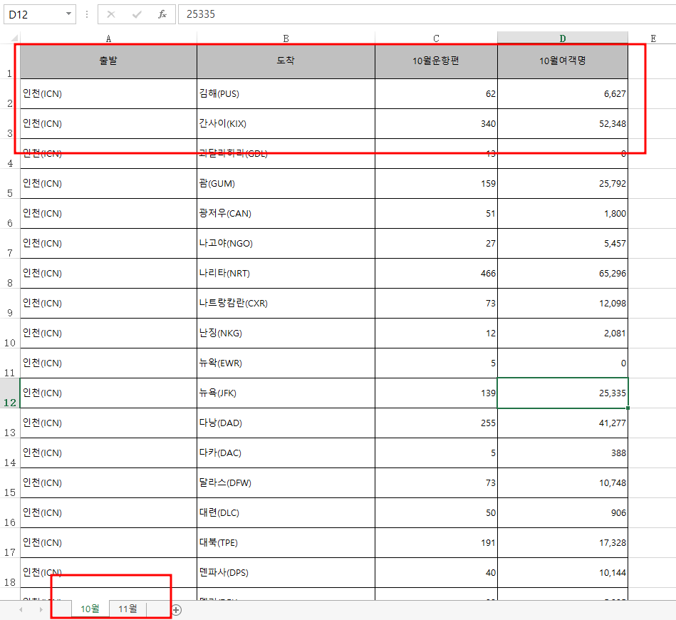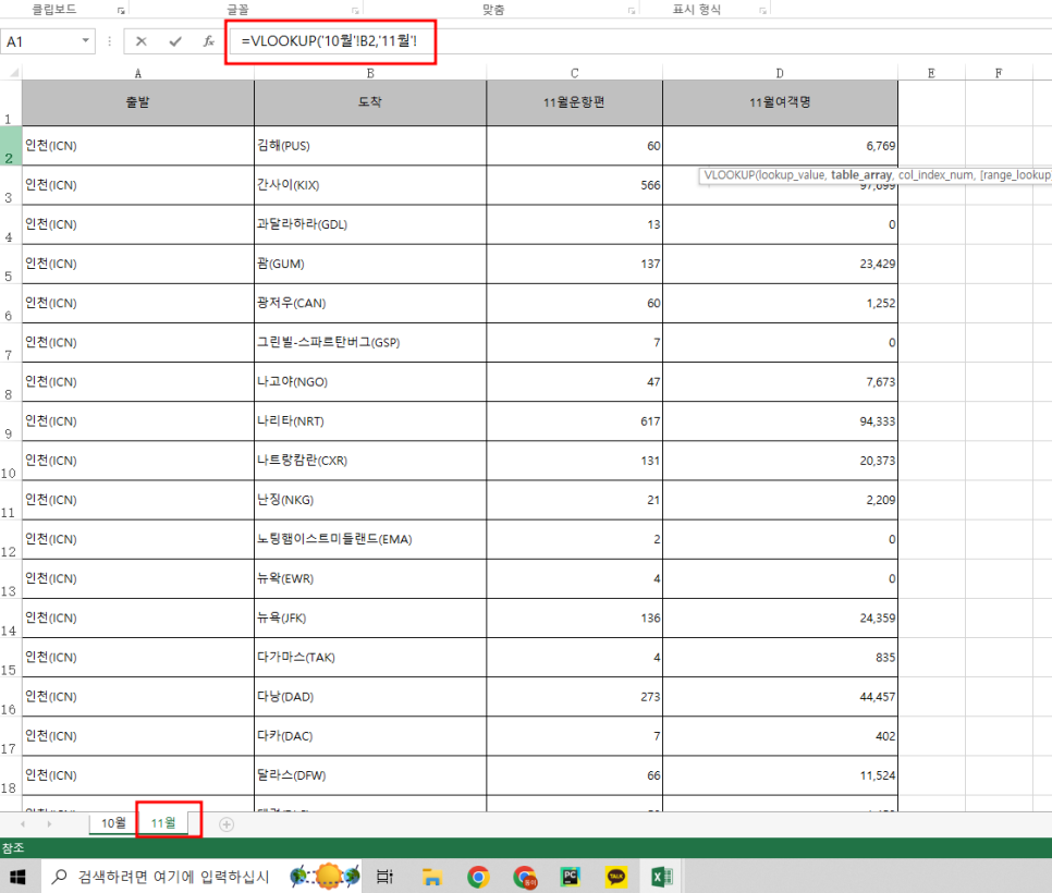 탭이 10월과 11울의 탭이 있는것을 볼 수 있습니다. 그럼 우리는 10월운항편과 11월 운항편을 비교해보겠습니다. 행들이 저렇게 많은걸 손으로 찾아가며 우리는 비교할 수 없습니다. 전주대비를 비교하고 싶은데 어떻게 할까요? 서로 다른 탭에 있는 자료를 비교해보겠습니다.
