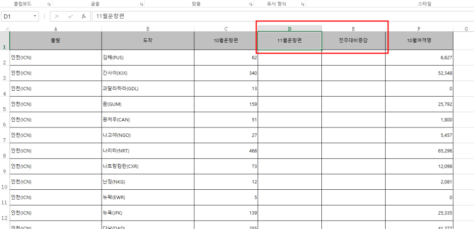 10월 운항편 탭에 D열과 E열을 만들어줍니다. 제목은 11월운항편 전주대비증감으로 셀제목을 입력해줍니다.
