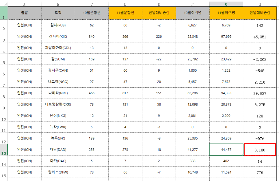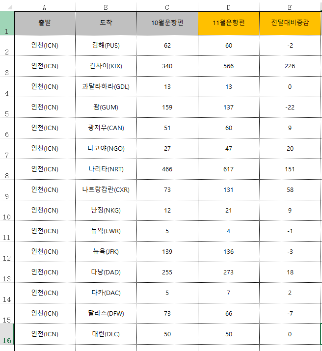 11월에서 10월의 운항편수를 빼주면 증감이 나오겠죠. 간사이공항이 226편이 증가된것을 볼 수 있습니다. 괌공항은 -22편이 감소된것을 볼 수 있습니다. 우리는 여기서 한번씩들 연습해보겠습니다.