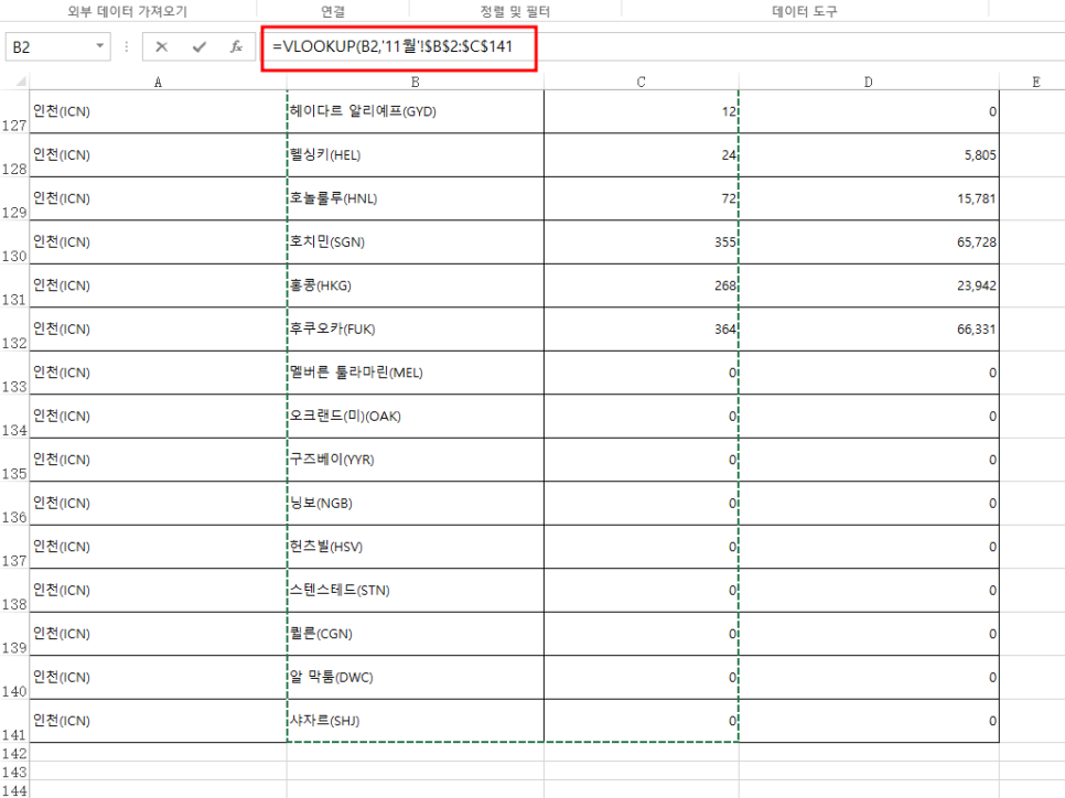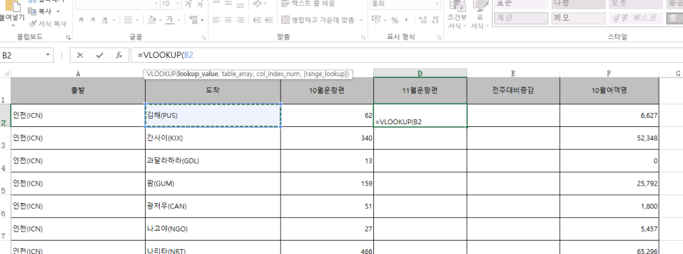 오늘은 VLOOKUP을 이용한 전달 대비 인천공항 출발 노선 증감에 대하여 알아 보았습니다.