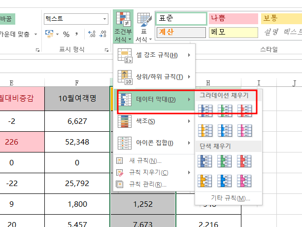 데이터 막대 그라데이션 채우기를 클릭해줍니다.