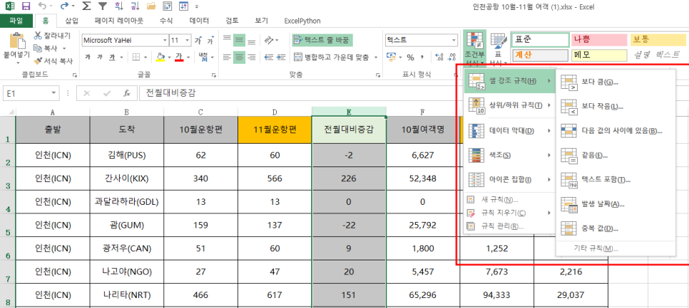 오늘은 IF을 이용하지 않는 출발 노선에 대한 조건부 서식을 적용해 보았습니다.