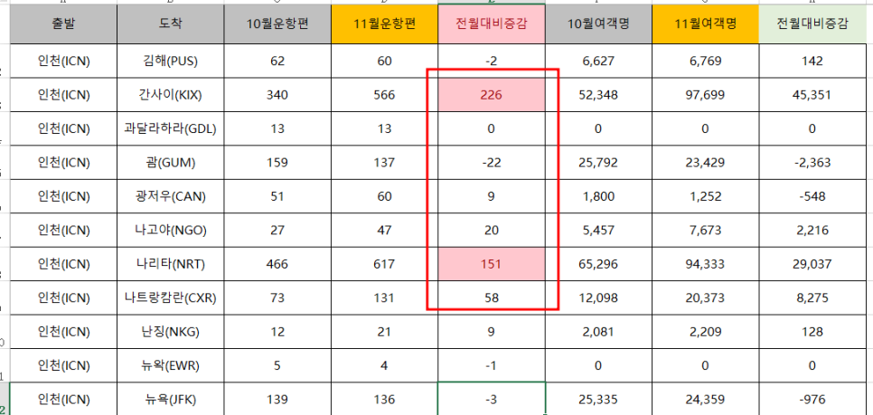 100편이상 증가한 노선에 빨강색 글씨로 바뀌며 색이 칠해진 것을 볼 수 있습니다.