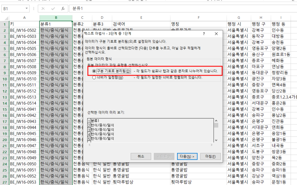 우리는 여기서 B 열을 구분 기호로 분리를 해 보겠습니다.