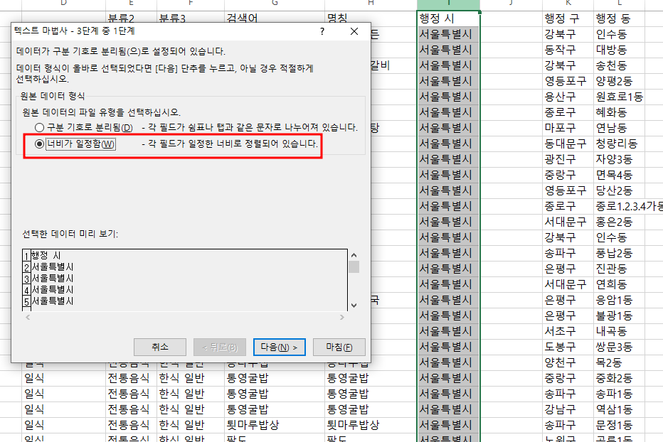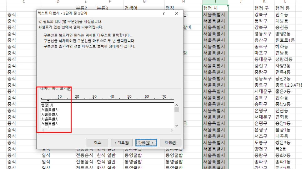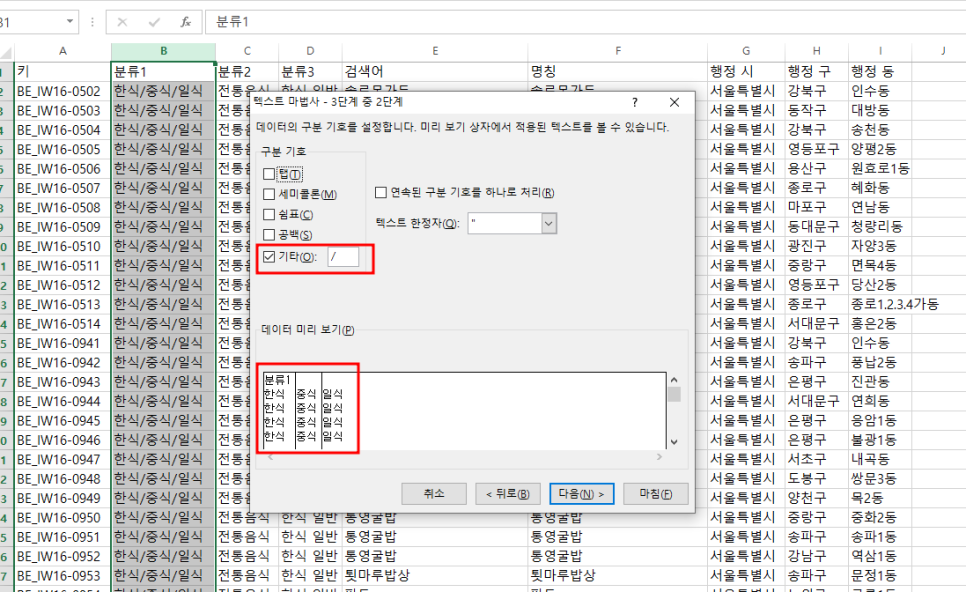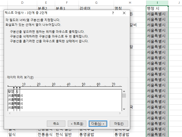 함수로 나누는 방법과는 다르게 데이터 나누기 마법사를 이용해서 알아보겠습니다.