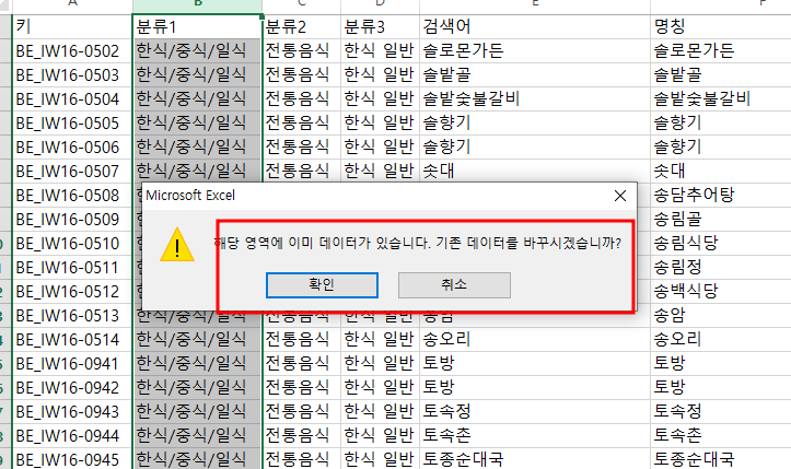해당 영역에 이미 데이터가 있습니다. 기존 데이터를 바꾸시겠습니까?라는 문구가 표출됩니다.