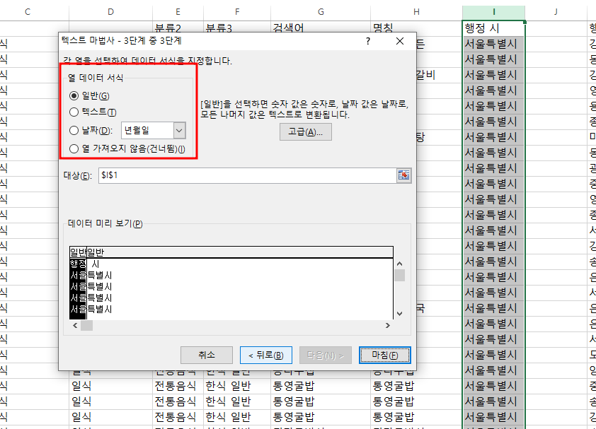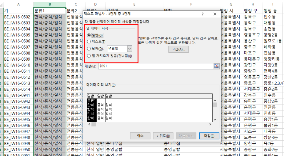 다음을 클릭하면 각 열에 대한 데이터 서식을 지정할 수 있습니다. 저는 일반으로 지정해 보겠습니다.