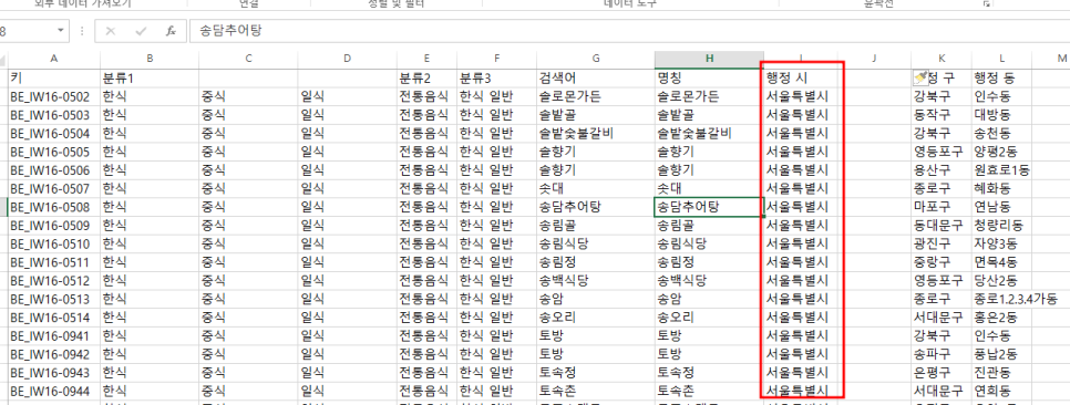 확인을 누르면 분류 2, 분류 3에 덮어씌워지기가 됩니다. 그래서 우리는 사전에 빈열을 추가 삽입해야 합니다.