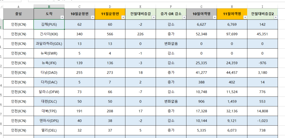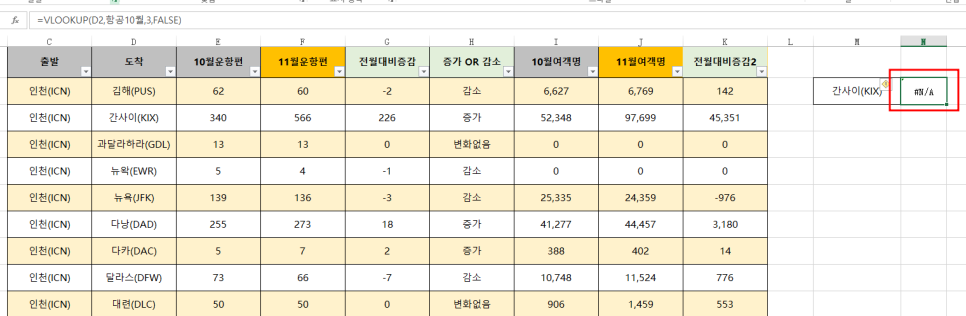 B 열부터 I 열 까지가 항공 10월 표 이름으로 설정해 주었습니다. 그럼 VLOOKUP을 해 보겠습니다. 간사이 공항의 10월 운항 편수를 찾아보겠습니다.