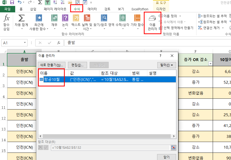 수식 - 이름 관리자에 들어가 보면 이름이 항공 10월로 잘 저장된 것을 볼 수 있습니다. 이후에 이름 관리자에 대해서도 포스팅해보도록 하겠습니다.