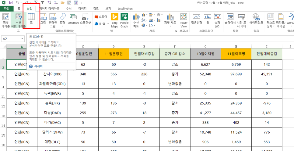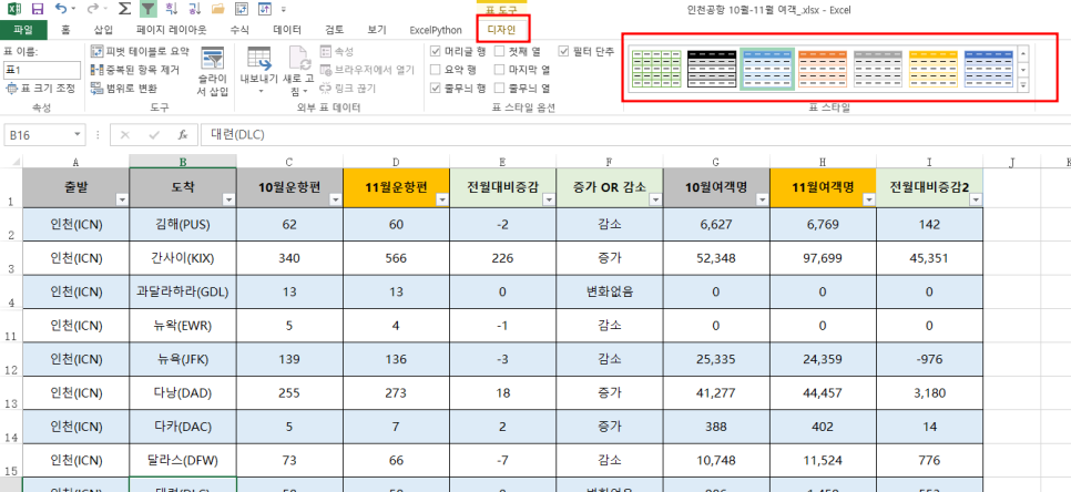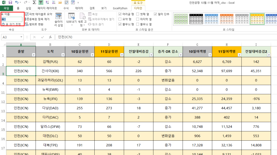 디자인 탭에 표 이름 정의가 있습니다. 바꾸어 볼까요, 저는 항공10월로 바꾸어 보겠습니다.