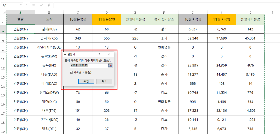 테두리에 점선으로 표시되면서 표 만들기가 뜨는 것을 볼 수 있습니다. 그리고 표에 사용할 데이터를 지정하십시요 라는 문구가 뜨는 것을 볼 수 있습니다. 자동으로 지정되어 있기 때문에 셀 이 정확히 지정되어 있나 확인해 봅니다. 머리글 포함까지 클릭해줍니다.
