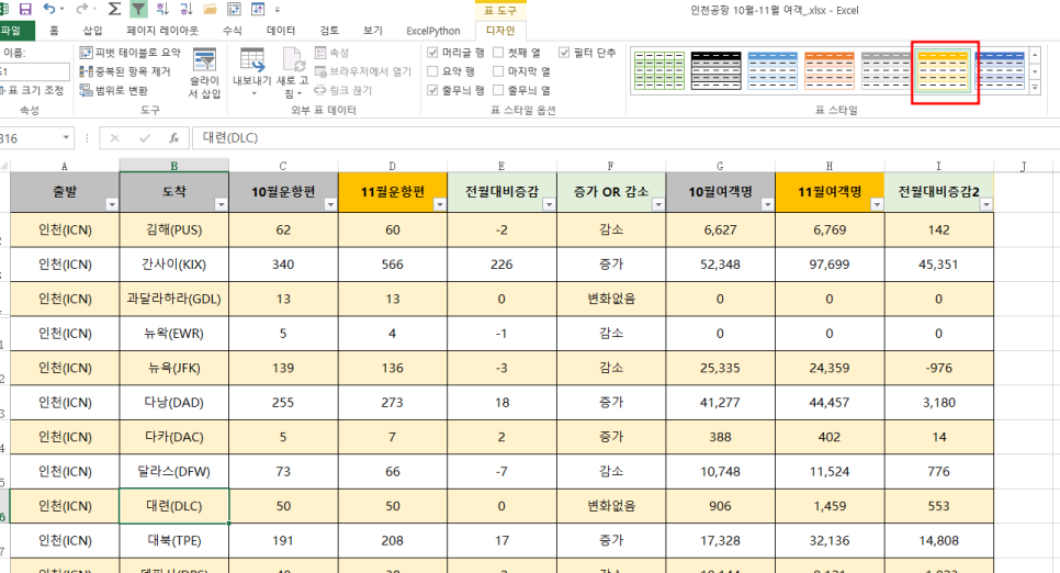 디자인 탭에 표 이름 정의가 있습니다. 바꾸어 볼까요, 저는 항공10월로 바꾸어 보겠습니다.