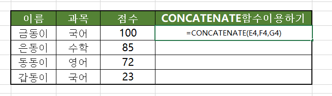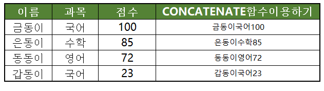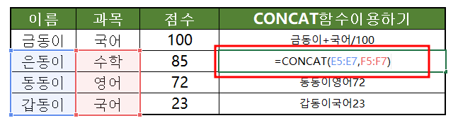 EX) 이름 과목 점수를 합치기를 해 보겠습니다.