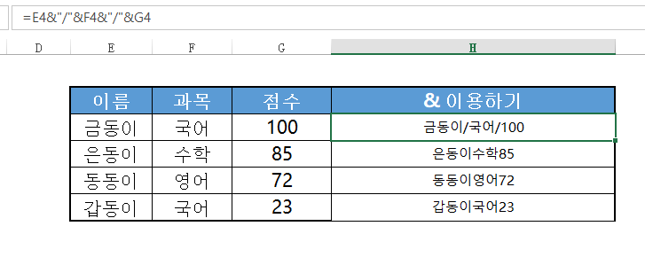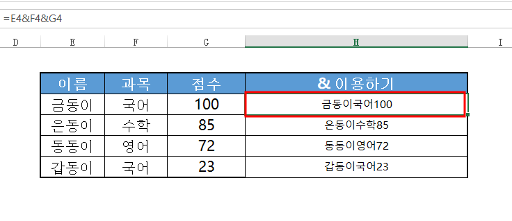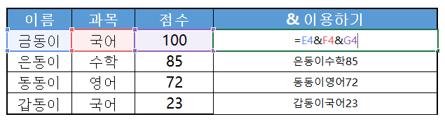 사용법 : 셀과 셀 사이에 & 넣어주면 됩니다.