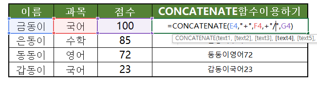 함수 사용 방법 : =CONCATENATE(셀 1, 셀 2, 셀 3, ...)
