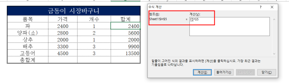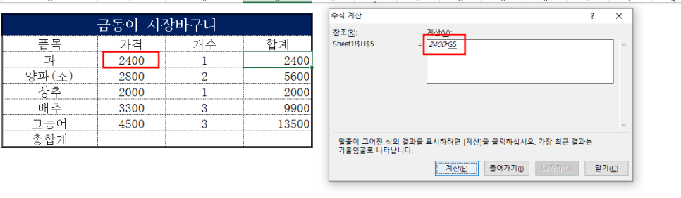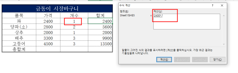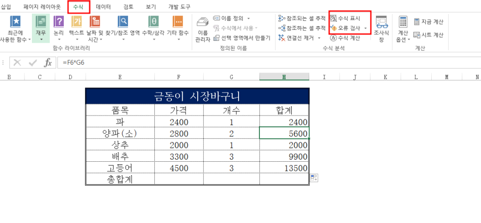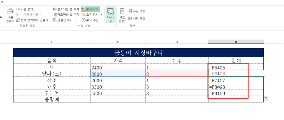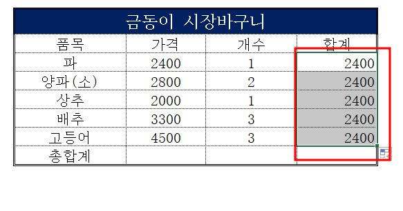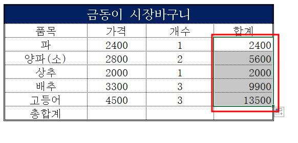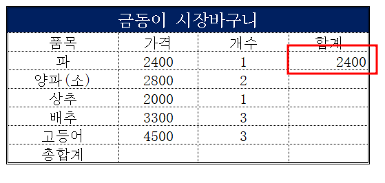 계산이 자동으로 설정되어 있기 때문에 양파(소), 상추, 배추, 고등어 등이 자동으로 계산된 것을 볼 수 있습니다.