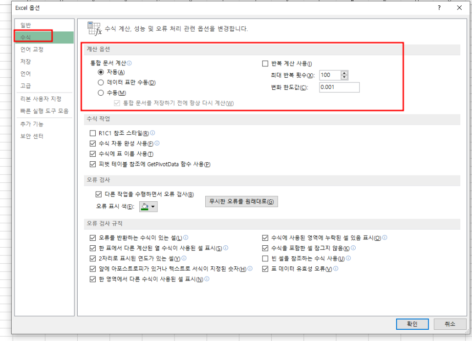 파일 - 옵션 - 수식을 열어보면 아래와 같이 계산 옵션이 나옵니다. 기본적으로 자동으로 지정되어 있습니다.