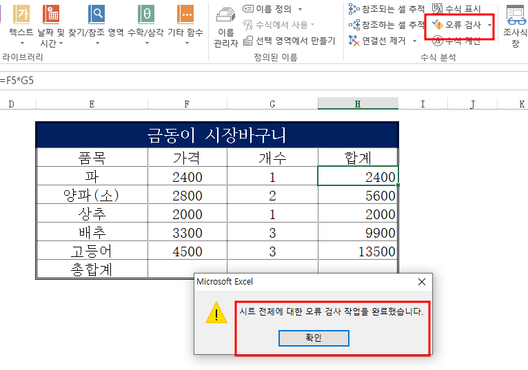 오류 검사를 클릭하면, 시트 전체에 대한 오류 검사 작업을 완료했습니다.라고 나옵니다.