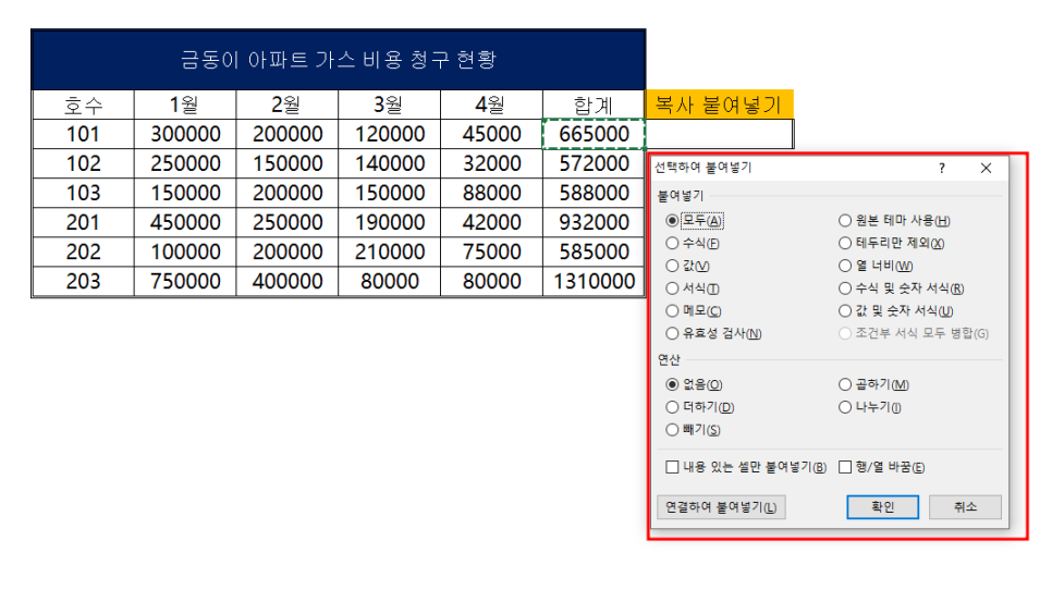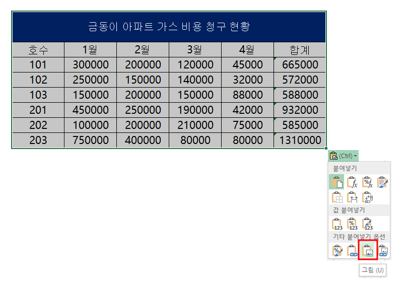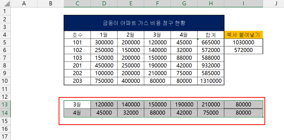 내가 원하는 C13셀부터 행/열이 바뀌어 붙여넣기 된 것을 볼 수 있습니다. 쉽게 붙여넣기 할 수 있겠죠. 그럼 금동이 아파트 가스 비용 청구 현황을 그림으로 붙여 넣기를 해 보겠습니다.