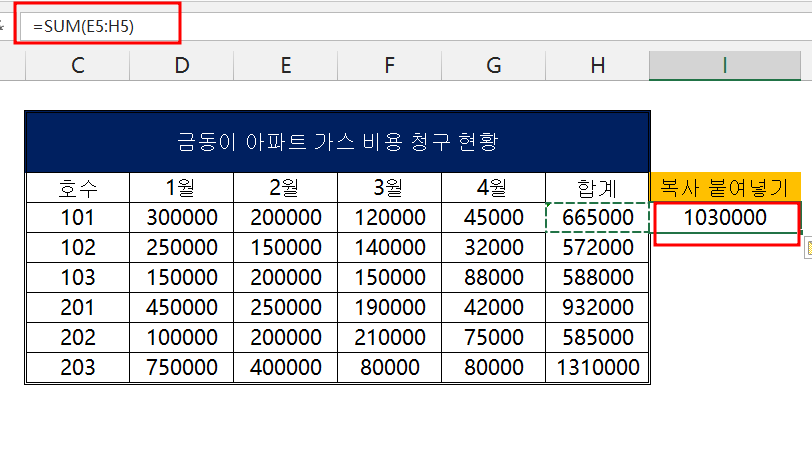 모두 붙여넣기를 하면 E5:H5까지의 더한 값들이 I 셀에 붙여넣기가 됨을 알 수 있습니다. 셀 이 한 칸씩 밀리면서 SUM 함수가 그대로 사용된 것을 볼 수 있습니다. 그럼 우리는 여기서 101호에 대한 합계만 복사 붙여넣기를 하고 싶습니다.