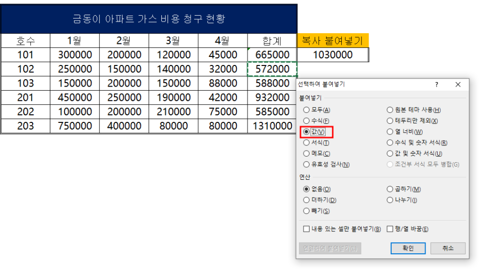 101호에 해당하는 합계를 ctrl+c를 복사하고 또는 우측 마우스 복사를 클릭 후 다시 우측 마우스를 클릭합니다.