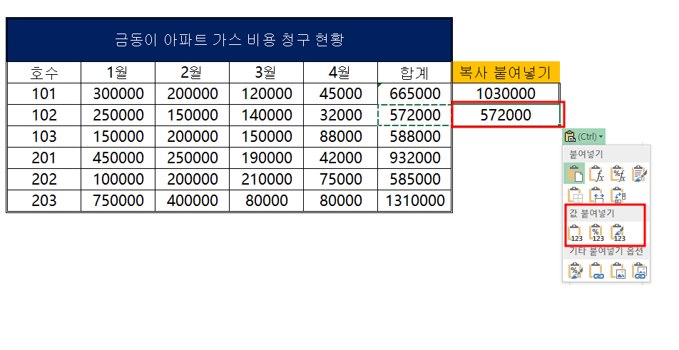 SUM 수식은 없어지고 102호의 합계 값만 붙여진 것을 알 수 있습니다. 또한 CTRL을 클릭해 보면 붙여넣기 양식들이 쭈욱 나옵니다. 거기서 내가 붙여넣기를 하고 싶은 것을 찾아 클릭하면 그대로 바뀌는 것을 알 수 있습니다.