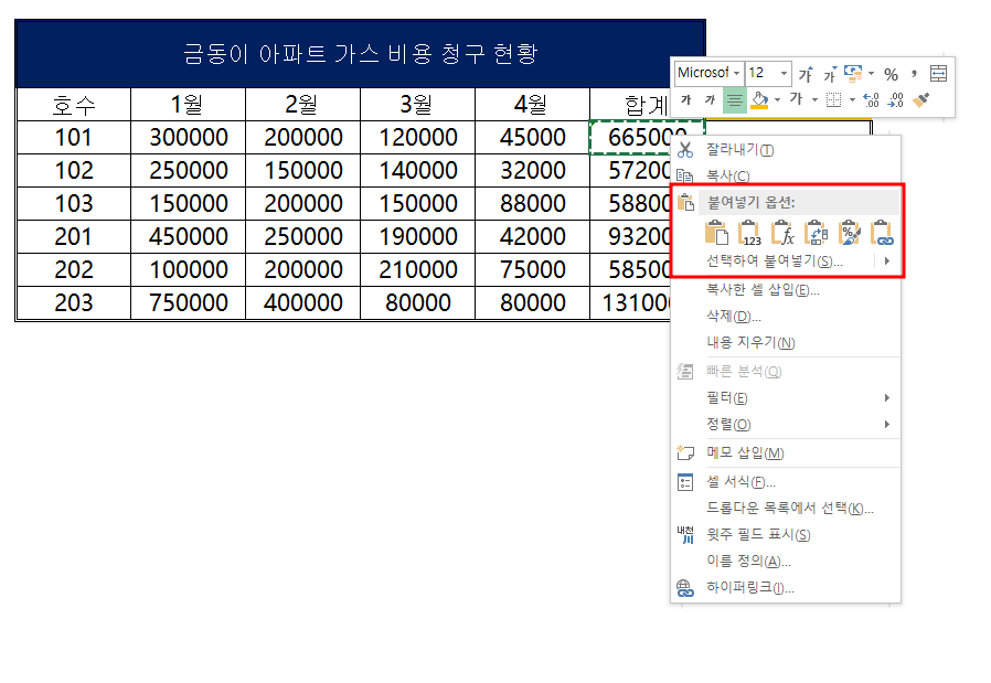 101호에 해당하는 합계를 ctrl+c를 복사하고 또는 우측 마우스 복사를 클릭 후 다시 우측 마우스를 클릭합니다.
