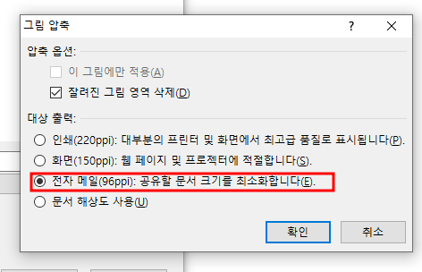 그럼 위와 같이 그림 압축이 뜨면서 화면(150ppi): 웹페이지 및 프로젝터에 적절합니다.를 해 주어도 되지만, 전자메일에 맞게 최소화를 시키는 것을 선택했습니다. 이미 그림파일의 용량이 작기 때문에 더 최소화할 수 있는 방법을 선택합니다.