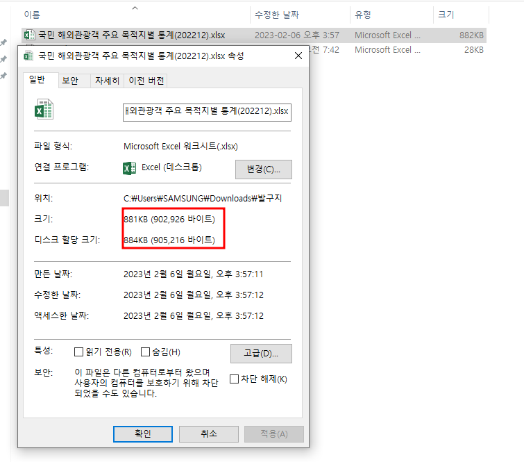 국민 해외 관광객 주요 목적지별 통계가 있습니다. 크기는 881KB입니다. 그럼 이 파일을 용량을 다른 이름으로 저장해서 줄여보겠습니다.