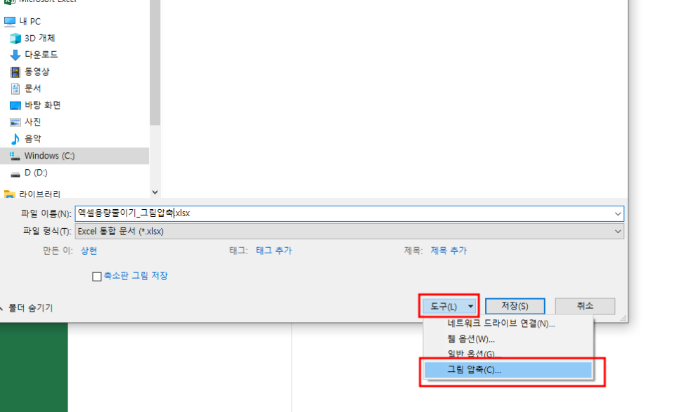 파일 형식은 똑같이. XLSX 형태로 지정을 해 주었고, 위와 같이 도구 그림 압축을 클릭합니다.